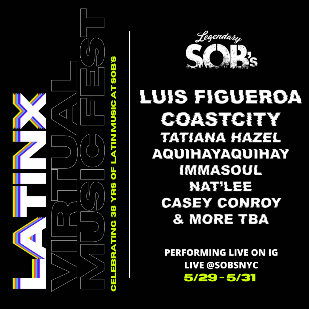 Celebrate ✨SOB’s 38th Anniversary✨ at our virtual LATINX CONCERT! 38 years ago SOBs opened its doors to highlight world music and expose audiences to Afro-Latinx genres. We are so excited to be celebrating our Latin roots with performances by Luis Figueroa, AQUIHAYAQUIHAY, COASTCITY, Casey Conroy, Grizel Chachi Del Valle, Natalie Rodriguez, Tatiana Hazel, and Immasoul???????????????? Join our live on 6pm at 8pm EST !
