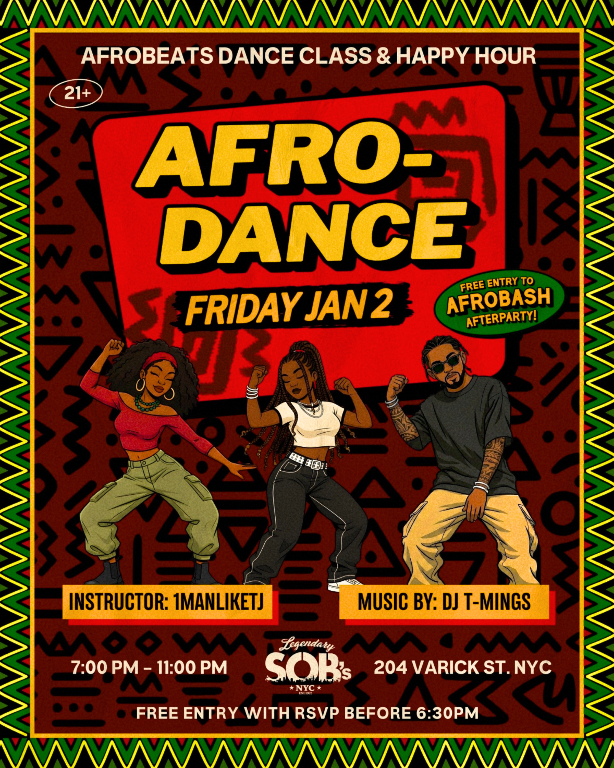 Welcome to Afro-Dance: a fan-favorite night in New York City with afrobeats dance classes, happy hour, dinner & drinks, and live DJs spinning afrobeats, amapiano, & more.