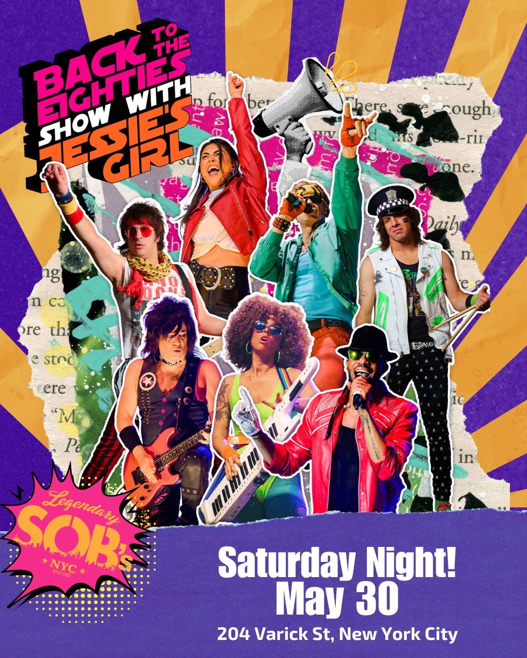 Jessie’s Girl’s primary line-up includes a team of NYC’s top rock and pop vocalists: Destinee Monroe, Jerome Bell-Bastien, and Mark Rinzel. They are backed by one of the tightest bands in the city comprised of 20+ year veterans of the NYC music scene: Eric Presti on guitar, Drew Mortali on bass, Michael Maenza on drums, and Karlee Bloom on keys and keytar. Each with dozens of credits performing with authentic ‘80s icons who made the music famous to begin with!