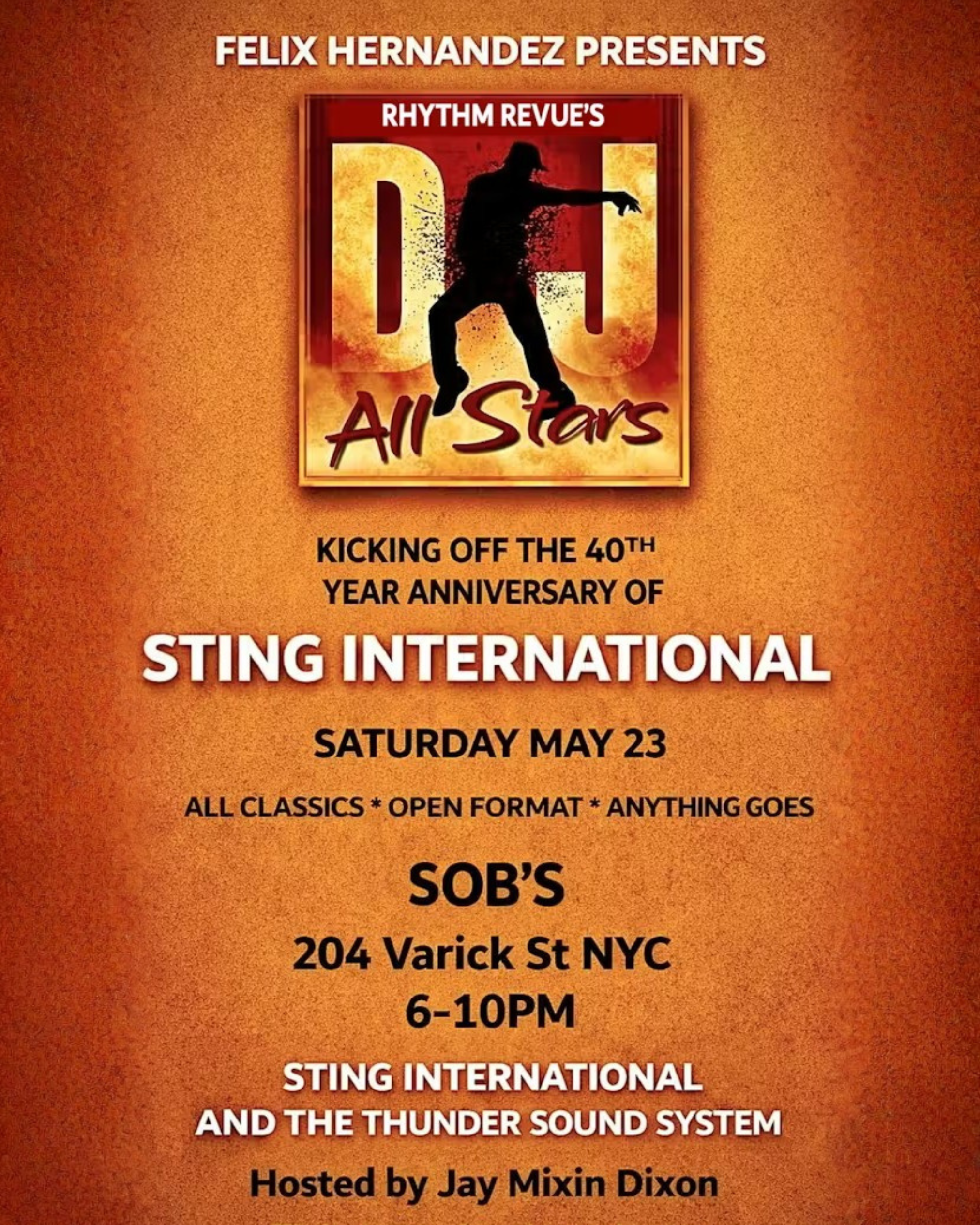 Rhythm Revue Dance Party became official in 1991, and has since been a staple in the classic soul, R&B, and dance communities for over 30 years! STING INTERNATIONAL KICKS OFF HIS 40th YEAR ANNIVERSARY. COME EXPERIENCE THE WORLD RENOWNED THUNDER SOUND SYSTEM.