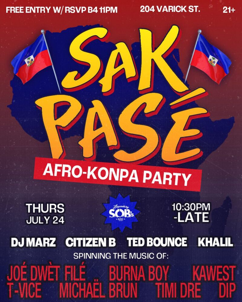 Introducing SAK PASE AT SOB’s! A brand-new Afro-Kompa party in Soho NYC with live DJs spinning the music of Joé Dwèt Filé, Burna Boy, T-Vice, Timi Dre, Michaël Brun, Wally Seck, Paska, Naza, Kawest, DIP, and more afrobeats, kompa, rara, raboday, amapiano, zouk, and hip hop. Back by popular demand after the first two SOLD OUT parties.